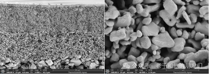 图1 陶瓷过滤膜截面。低加速电压不镀金成像,可辨别支撑体上不同孔尺寸的3层过滤膜,膜层颗粒堆积的形态以及颗粒表面细节。图注:着陆电压500V,减速电压2KV,束流25pA,赛默飞Apreo2T1探测器。