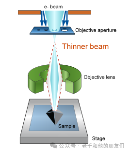 因此,当WD较小、聚光透镜激励较高、光阑较小时,我们就能实现小的束斑尺寸。这三个参数是相互影响的,需要仔细权衡,才能获得图像,因为它们还会影响其他参数,如焦距和电子信号强度。