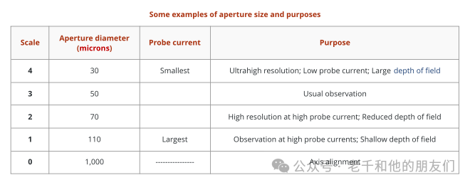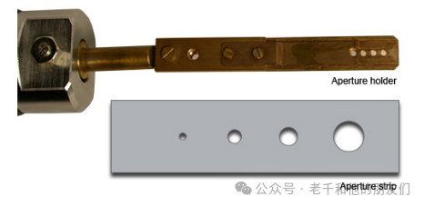 物镜光阑安装在SEM物镜的上方,是一根金属杆,用于固定一块含有四个孔的金属薄板。在它上面装有一个更薄的矩形金属板,上面有不同大小的孔(光阑)。通过前后移动机械臂,可以将不同大小的孔放入光束路径中。这都限于老式扫描电镜,现代电镜通过静电偏转到想要的孔,不是机械移动。