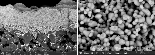 图2 陶瓷过滤膜截面。低加速电压不镀金成像,可清楚的辨别支撑体上不同孔尺寸的2层氧化锆过滤膜,膜层颗粒堆积的形态。图注:5KV,束流50pA,赛默飞Apreo2 T1 探测器。