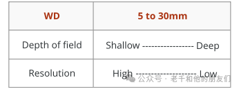 图16 不同工作距离带来的景深效果不一样,WD越大,景深越好