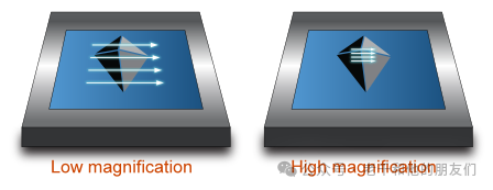 放大是指放大图像或图像的一部分。在SEM中,放大是通过扫描较小的区域来实现的。在图像中,样品上的电子束用箭头表示。