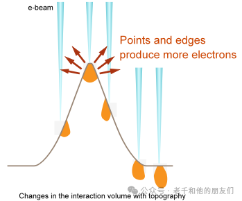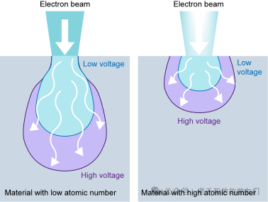 图8 不同加速电压下,电子束与样品的相互作用体积不一样,高加速电压穿透的更深