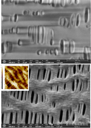 图23 锂电池干法隔膜。上图,不镀膜,即使在500V低电压下,T2探测器成像存在明显的充电效应,隔膜形态无法辨别。下图,镀膜后,可以很好的缓解充电效应,用T2能拍清楚隔膜表面细节轮廓和孔隙的大小,插图为AFM图,可以证实,溅射的过程并没有对隔膜造成损伤,保持了较真实的结构细节。