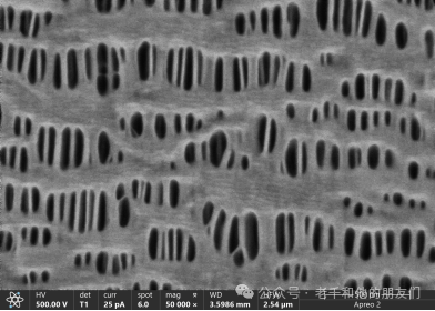 图24 锂电池隔膜。除了镀膜处理,采用Apreo2的T1探测器可以直接对隔膜成像,相比镀膜后的效果,表面细节可以辨别,但还不够清晰。