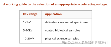 下表中提供了选择加速电压的一般操作指南。当然,不同的电镜设备,即使参数相同,成像效果也会有差异,要确定样品成像的设置,需要进行实践操作。
