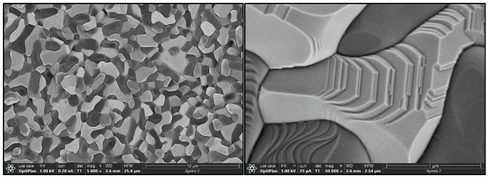 图4中的SrTiO3陶瓷晶粒取向通过扫描电镜的背散射探测器清晰呈现出来,晶粒之间没有较大的气孔存在,并且表面生长的台阶清晰可见。