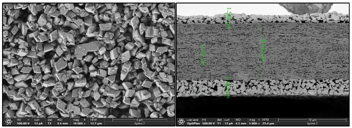 应用到新能源行业的另一类陶瓷是氧化铝(Al2O3)陶瓷,Al2O3是一种无机氧化物,也是一种惰性材料。作为陶瓷涂层涂覆到锂电池中的隔膜上,可以起到耐高温、绝缘的作用,防止隔膜因电池内部温度过高熔化而导致的短路,避免可能因此发生的火灾爆炸。隔膜表面的Al2O3陶瓷涂层以及截面的微观结构如图5所示,陶瓷颗粒之间并未紧密堆积,而是形成,分布均匀的微孔结构,对锂离子在正负极之间的转移起到促进作用,同时在负极材料与隔膜之间形成一道屏障,防止锂枝晶穿透隔膜导致的内部短路问题。