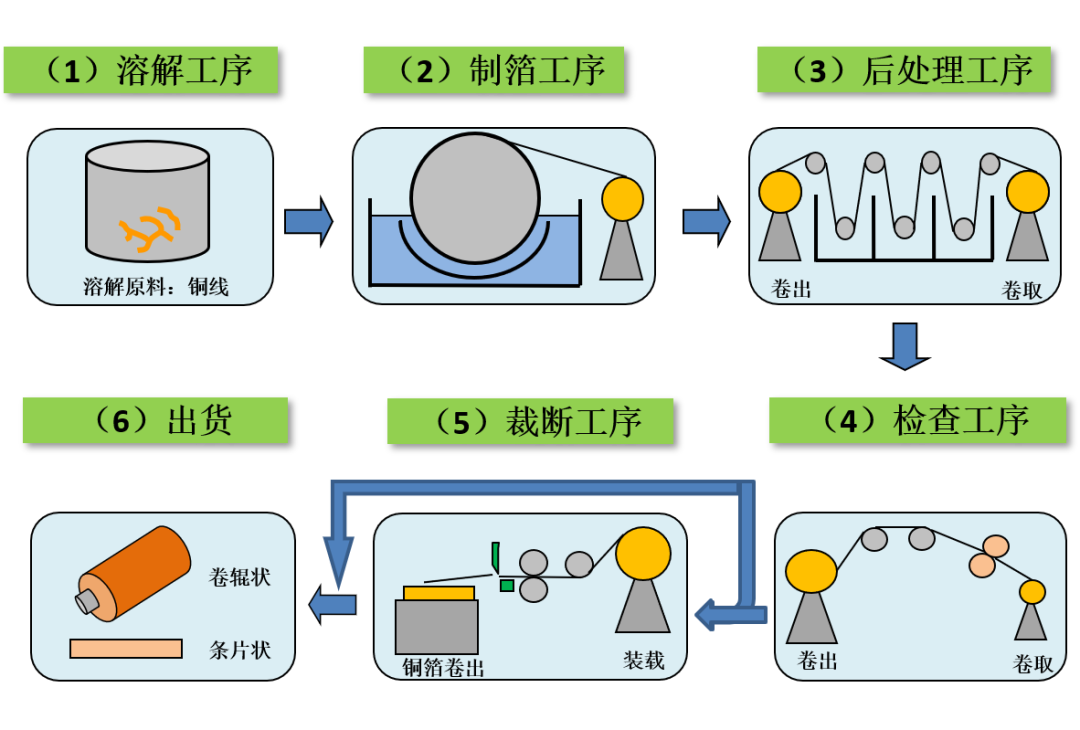 铜箔由于具有良好的导电性、柔韧性和适中的电位,耐卷绕和辗压,制造技术成熟,且价格相对低廉,在电池充放电过程中便充当石墨等负极活性材料载体,同时作为负极集流体,将电池活性物质产生的电流汇集起来,以产生更大的输出电流。相比于电子铜箔,锂电铜箔要求铜箔的厚度更薄,表面更光滑,晶粒更细小且均匀。