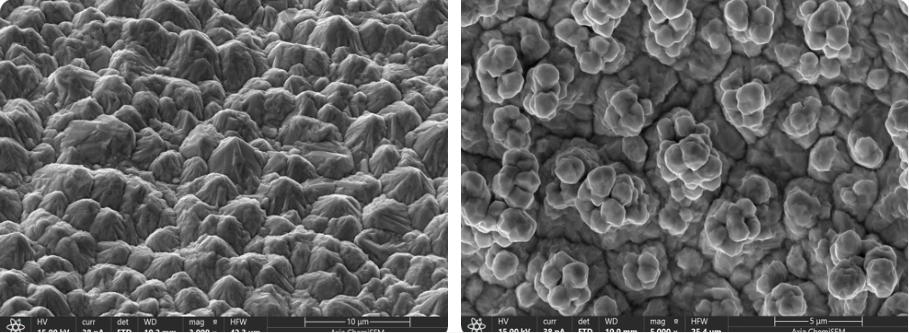 如下图3所示,采用赛默飞智能型钨灯丝扫描电镜AxiaChemiSEM所获的的PCB铜箔毛面形貌图。图3右图铜箔晶体晶粒细小紧密且均匀,结晶组织为等轴、球形晶粒结构。铜箔粗化面呈现较浅而圆的轮廓状,而传统工艺生产的厚铜箔(图3左)是锯齿状或山丘形的表面状态。