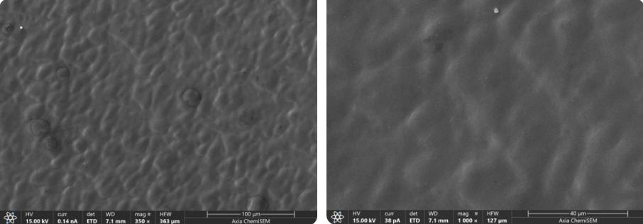 如图4采用赛默飞智能型钨灯丝扫描电镜AxiaChemiSEM所拍摄的锂电铜箔表面形貌。从图中可以看出,铜箔毛面非常平整、无明显缺陷,说明该工艺配方具有较好的整平效果,得到的铜箔组织均匀且具有较好的外观。