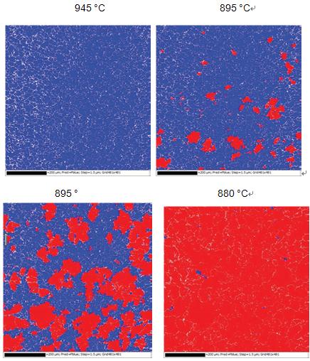 本图显示从945°C 到880°C 奥氏体向铁素体转变的EBSD相分布图,奥氏体为蓝色(暗),铁素体为红色(亮)。测试用了一个低碳钢试样,加热到945°C,然后以每分钟1 °C的速度冷却,直到观察到相变开始。一旦相变开始,保温以观察单个晶粒中相的变化过程,然后再次冷却。数据由OxfordInstruments的Singh Ubhi博士提供。