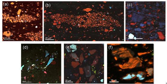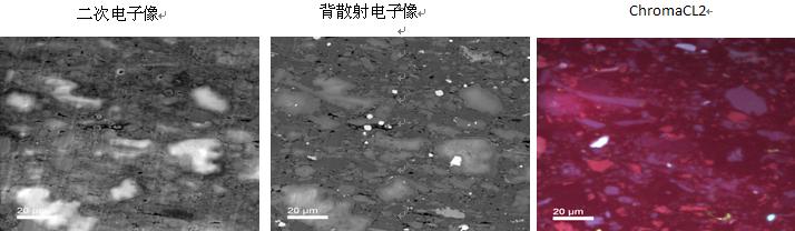 图4 经过Gatan Ilion+制样后的页岩横截面图像,chromacl2揭示石英颗粒混合来源